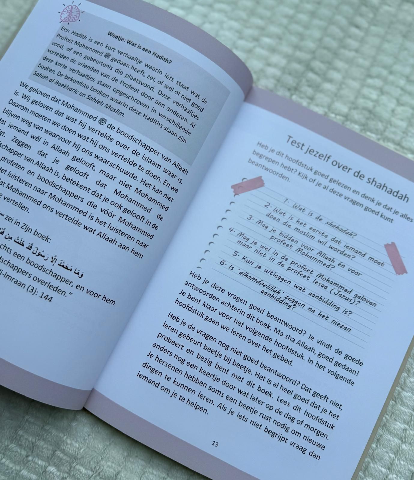 Tevens bevat dit boek een uitgebreide en geïllustreerde uitleg van de woedhoe (rituele reiniging) en het gebed. Ook is er na elk hoofdstuk een 'test-jezelf' toegevoegd zodat het kind de geleerde stof kan toetsen.