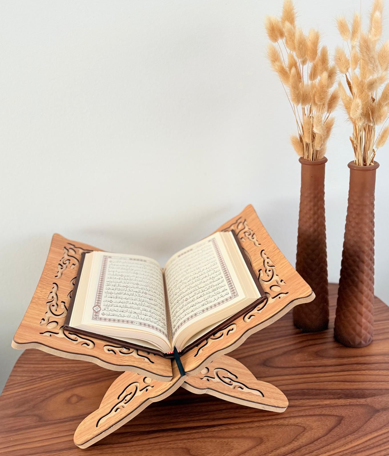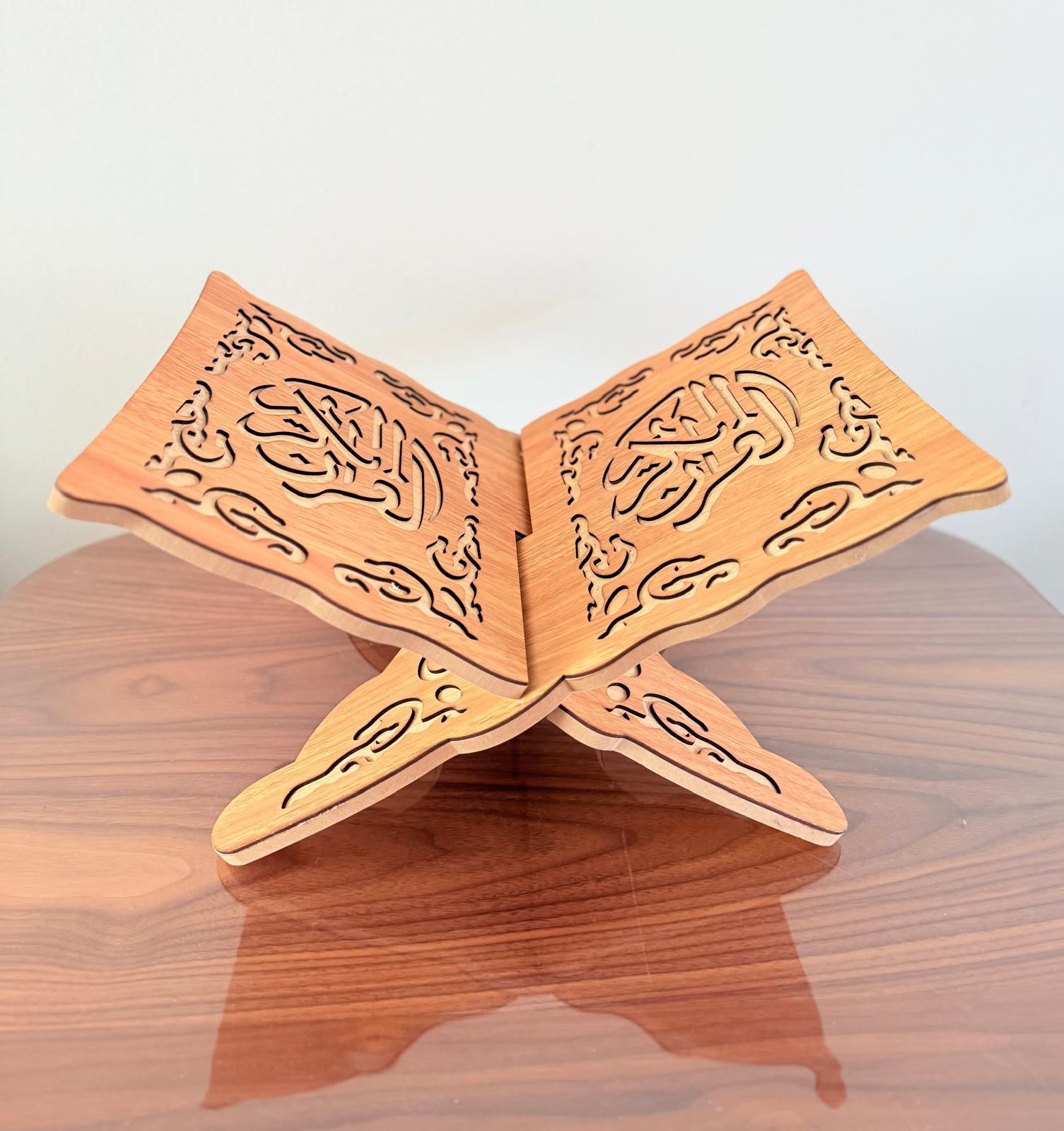 Mooie koranhouder met uitgesneden tekst en versiering. Licht van gewicht, makkelijk in elkaar te zitten en praktisch in gebruik. 32 bij 23 cm.
